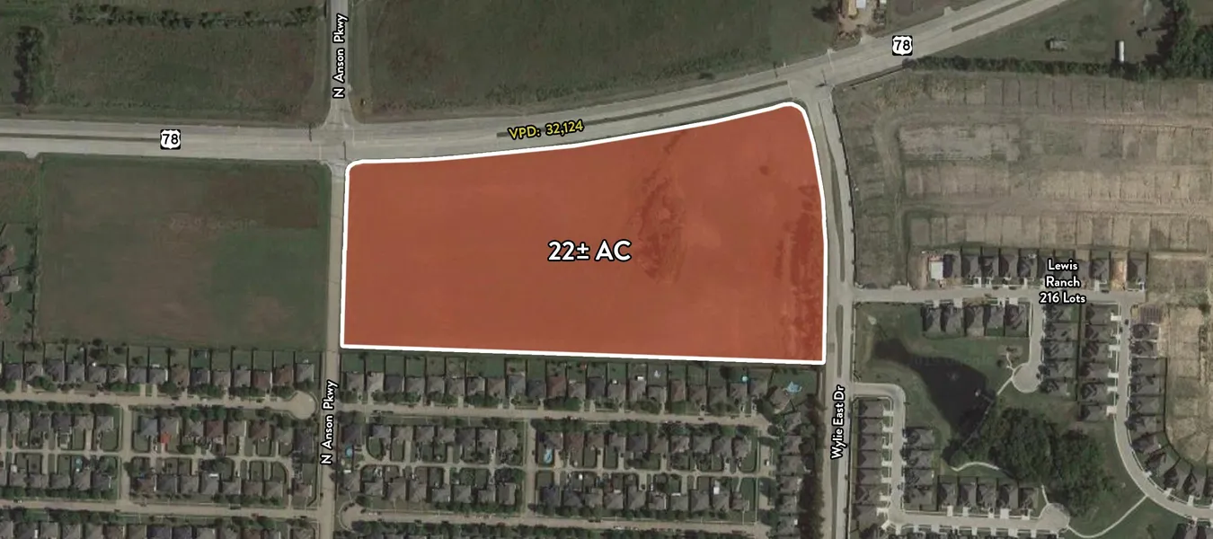 The property is located on Highway 78 between Wylie East Blvd. and Anson Parkway, immediately across from the 400-acre Kansas City Southern Railway Intermodal Development and adjacent to new single-family development. Just west of the property, approximately mile, is a Walmart Super Center.