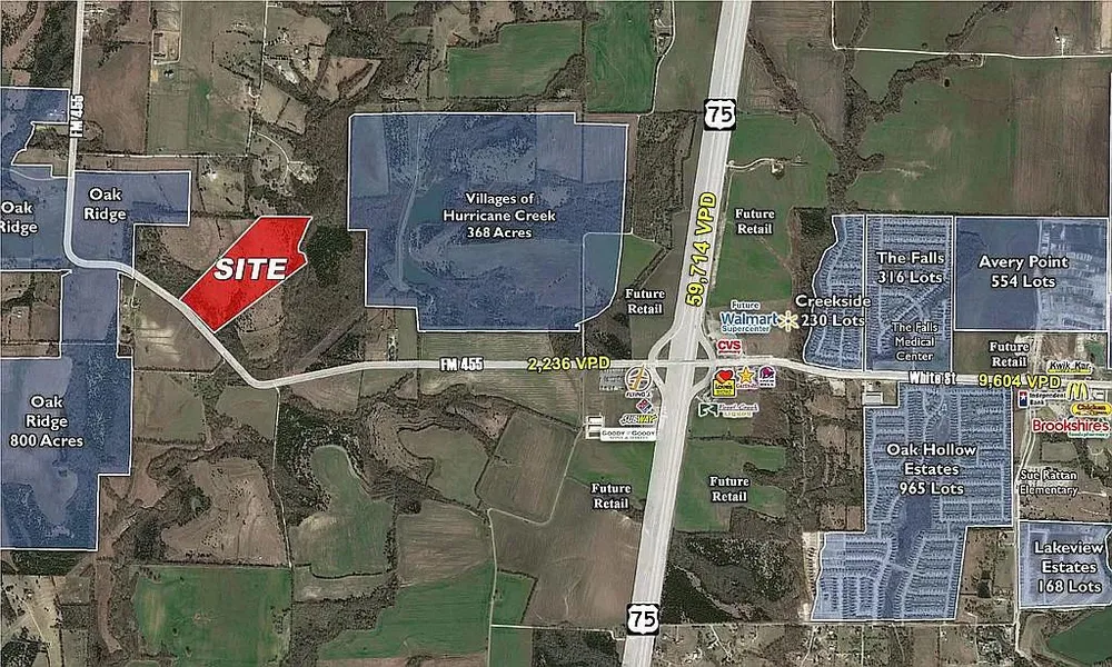Annas Thoroughfare Plan shows a realignment of FM 455 bringing a Major Highway through the site and creating a future intersection In conjunction with the thoroughfare plan, Annas Future Land Use Plan shows 2 Commercial corners on the site with the balance of the site being designated Single-Family Beautiful property with creeks, mature trees, views & minimal flood plain For Investment, Single-Family large lot development, Country Estate, Recreation, etc. Access to Hurricane Creek Anna I.S.D. Ag Tax Exemption