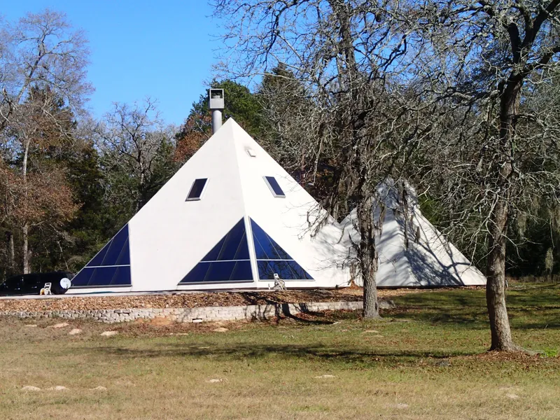 ONE OF A KIND!! This is, without a doubt, one of the most unique properties you will ever find! The Stucco exterior, Pyramid style home features open concept living, kitchen and dining area, with 2 wood burning fireplaces (one is in the Master Bedroom), and comes complete with all furnishings, leather sofa, loveseat and chair in living room). Recent updates include granite countertops in baths and kitchen, tile and wood laminate flooring, updated bathroom fixtures, energy efficient windows, washer & dryer, and stainless steel refrigerator. The sunken living area is open with a large fireplace adorned with petrified wood from Cat Spring, and lots of windows that have you at eye level for viewing the abundance of wildlife in the area. An Olympic pool (70' x 25`), with Gunite Diamond Brite surface (pool also has a cover for the winter months) will be fun for hosting swimming competitions or just relaxing and floating your cares away.