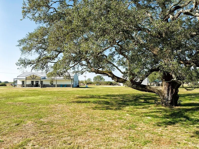Nestled on 24.48 acres this custom-built (2022) 2,508 SF barndominium blends rustic charm with modern luxury. The home's exterior is highlighted by large front and back porches, sprawling century-old live oak trees and private pond for your outdoor enjoyment. Spacious interior includes 3 bedrooms, 2 1/2 baths with natural concrete floors throughout. The living room with vaulted ceilings, exposed wood beams, crown molding & ceiling fans, gives this open floor plan a modern farmhouse look. The gourmet kitchen is complete with an oversized center island with leather quartz surface, granite countertops, premium Cosmo & GE appliances and a wine fridge. The walk-in butler's pantry sits nearby along with a x-large utility room with lots of storage! The primary suite is extra large, with a huge walk-in closet, spa-like bath featuring double vanities, separate shower and classic claw-foot soaking...