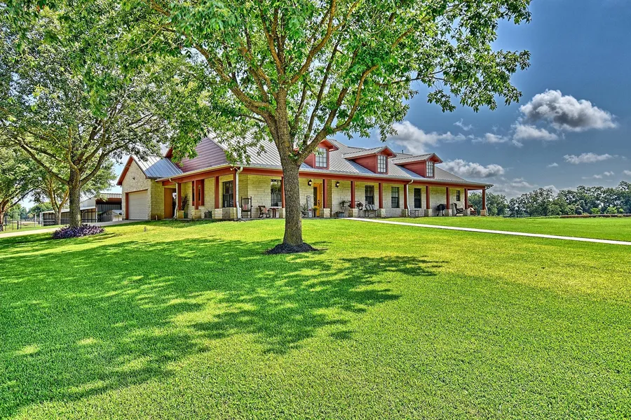 Located on the outskirts of Columbus on 2.0723 manicured acres, this 4BR/2.5BA Austin stone home with metal roof & attached garage with concrete driveway features 2,775 sqft of living space (4,090 sqft under roof) highlighted by numerous amenities. The family room's vaulted ceiling, wood burning fireplace, rustic wet bar with penny countertop & media center with surround sound are ideal for entertaining. Cooks will appreciate the kitchen's custom wood cabinetry with tile countertops, island with cooktop, wall oven & breakfast bar. The spacious primary bedroom's ensuite features a double vanity, jetted tub, walk-in shower & walk-in closet. The second & third bedrooms are joined by a Jack & Jill bathroom with double vanity & shower/tub combo. The fourth bedroom is currently being used as an office off the family room. From the foyer you can access two hall closets & a half bath. The front door of home faces south with porch that spans the length of the home where you can enjoy nice views of the irrigated lawn & sounds of the outdoors. The elevated foundation puts the finish floor of home 4.77 feet above the flood plain. An insulated metal building in backyard is perfect for storing "toys" & equipment, which also features an enclosed room with bathroom to suite your needs. An attached overhang can be used for trailer/RV storage. There's a fenced area with corral & four stalls that can be used for horses and/or FFA/4-H projects. The property is conveniently situated only 2 miles from I-10 & 45 minutes from Buc-ee's in Katy. Virtual Tour & Floor Plan w/ Dimensions available below. With so much to offer, this is a unique small acreage property where there's something for everyone to appreciate! Contact our office for additional info or to schedule an appointment to view. Tri-County Realty, LLC will co-broker with Buyer's Agent making initial contact & preset at all showings. Note- sqft measurements taken by Seller & should be independently verified.