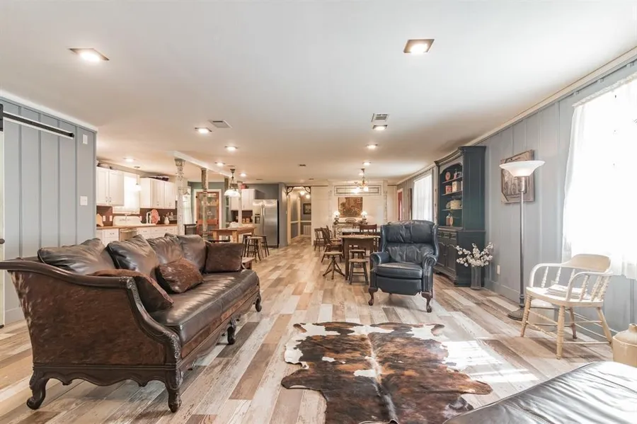 Well-appointed, remodeled ranchette home sits on nearly 2 acres in quiet neighborhood w/meticulously groomed grounds. Entry features vintage schoolhouse light fixture, antique porch posts & baluster. Kitchen features antique Kohler farm sink, Shaker style cabinets, American cherry butcher block countertops, antique bead board backsplash, antique porch post rolling island. Bedrooms feature spacious closets w/barn track doors. Master bath w/tin walls surrounding tub/shower combo, antique dresser w/twin vessel sinks. Guest bath w/bead board wainscoting, antique washstand w/vessel sink. Professionally installed "aged plank" porcelain tile throughout. Attached dbl car garage. 10'x70' covered back porch. Huge live oaks along w/mature pecan trees are situated over this acreage. All new 5,000 BTU HVAC system, new ductwork, new 50 gal water heater. New drain field for gray water system, toilets on dedicated septic. 1800 SF steel building w/workshop area/garage/RV storage/overhead door w/HVAC.