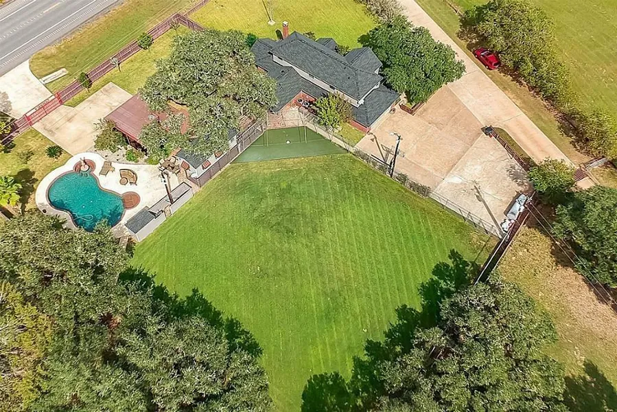 Entertainer's dream home located in Sheridan, Texas. Welcome home to your own recreational property with outdoor living at its finest! 3/2 1/2 home with new roof, updated kitchen and bath on corner 0.88+ acre! Commercial grade lighting illuminates your own private baseball diamond! Enormous backyard area with a 720 SF a/c private glass building used as a personal gym! A gorgeous in-ground pool surrounded by sundeck and palm trees with a sunning shelf and sunken table with seating. A huge covered patio with fire pit and outdoor kitchen is constructed around two century old oaks. Steps from patio lead you to a shady upper party deck where you will find built-in table and seating, covered wet bar, a commercial grade smoker along with an enclosed a/c 400 SF office/studio space! The property has two entries, one which is gated. This home is a must see "field of dreams!" Measurements approximate, taken from Colorado CAD. New survey available.