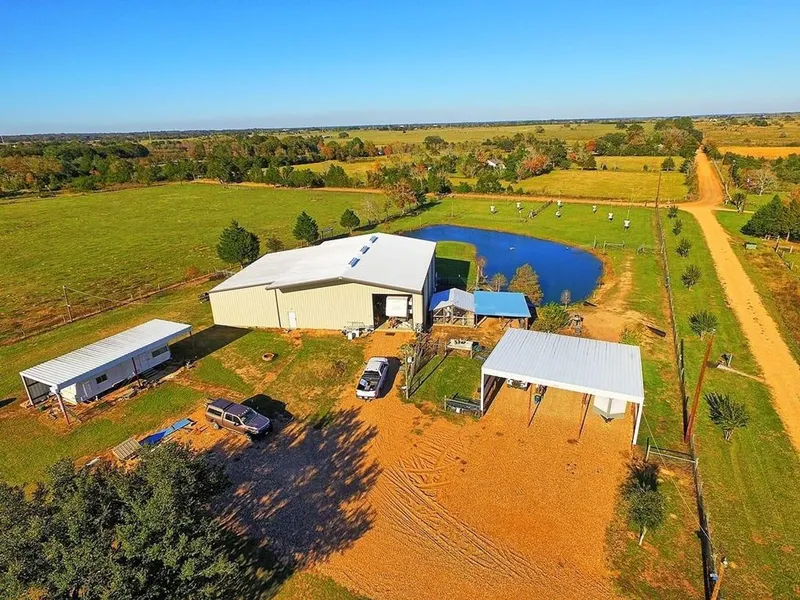 Located in Colorado County at the corner of Church Creek Ln & Nelson Ln, only 36 min (37.5 miles) west of Buc-ee's in Katy, this 3.245 acres is a MUST SEE if you're looking for improved small acreage! The property is highlighted by a 60'x60' insulated Straight Line Metal Building with 20' eave height, 30'x60' lean-to constructed with hot-dipped galvanized steel, (2) 14'x16' roll-up doors with galvanized casings, (2) walk-thru doors & concrete patio overlooking the pond. The building includes hook-ups for (2) RVs & kitchen area with frig, TV, gas range & commercial ice machine. Other improvements include a triple wide carport for additional vehicle/equipment parking, additional RV cover with hook-up, fish cleaning table & one-of-a-kind chicken coop with automated door, water, feed, lights & electric fence- all you have to do is gather the eggs! The horseshoe pond is surrounded by Cypress ...