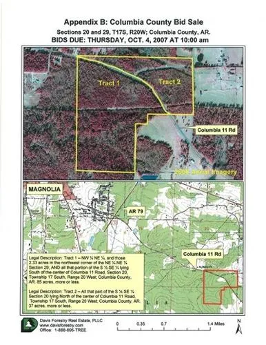 SEALED BIDS DUE 09-04-07. TO RECEIVE A BID PACKAGE, CALL OR EMAIL DFRE, PLLC OR CLICK THE 'CONTACT FOR MORE INFO' LINK ABOVE THE MAIN PHOTO. Tract Descriptions: These two tracts provide +/-122 total acres of timberland, development opportunity, and home site potential. Access to the tracts is excellent, and the properties are located less than five miles from Magnolia’s town square. Buyers will find access to electricity and gas. A 6-inch public waterline borders Tract 1, while Tract 2 is bordered by a 6-inch and a 10-inch public waterline. Tract 1: Approximately ½ mile of CR-11(Calhoun Road) serves as this +/-85-acre tract’s northern boundary. The property’s diverse attributes, including location, access, and merchantable timber, make this tract a desirable possibility for real estate investors in the Ark-La-Tex region. The northernmost +/-43 acres of this tract consist of 30 to 40-feet-tall natural pine and hardwood regeneration. Timber volume summaries for the southernmost +/-42 acres of the tract detailed stand tables are detailed in the BID PROSPECTUS – call to receive a bid prospectus on this tract. Tract 2: This +/-37-acre tract offers roughly one mile of paved road frontage. CR-11 serves as the tract’s western boundary, while the easternmost portion of CR-405 borders the property to the east. Additionally, the tract is bisected by CR-34. Thirty to 40-feet-tall natural pine and hardwood regeneration cover this tract. This property has excellent development potential. Access: The tracts lie approximately 1.5 miles east of AR 79, on each side of CR-11. The approximate boundary lines of the property are marked with pink DFC flagging.