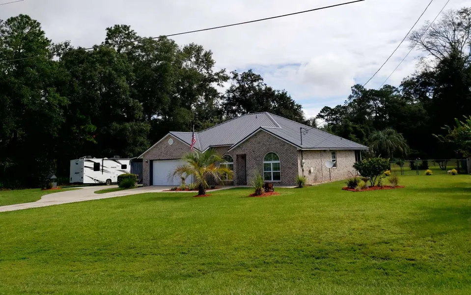 Florida Living with plenty of room, both inside and out, this property is just outside the city limits and close to an "A" rated elementary school. The garage was converted into two additional bedrooms heated and cooled leaving one other bedroom as a home office. Recently added retention pond by the county keeps this home dry during heaviest of rain storms yet adds beauty to the expansive back yard. Newer, roof, front windows and well.