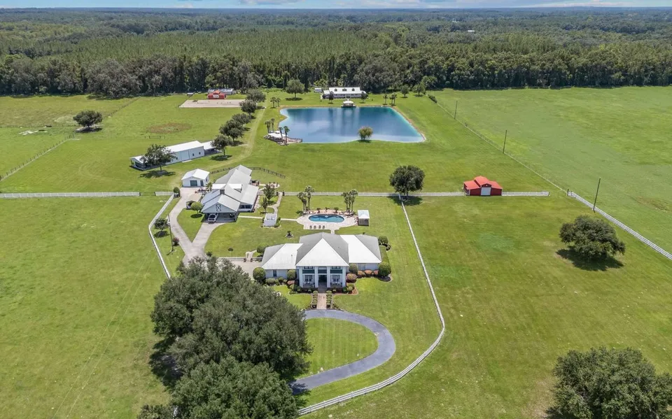 A rare opportunity to own 40 acres of paradise just minutes from town! This one-of-a-kind North Florida estate blends country charm with resort-style living, surrounded by lush green pastures that are fully fenced and cross-fenced for both beauty and function. The main home offers 3 bedrooms, an office (optional 4th bedroom), an upstairs loft, and 3.5 bathrooms. The owner’s suite is conveniently located on the main floor, providing a private retreat for rest and relaxation. Step out back and you’ll find your own private retreat—a gorgeous newly remodeled pool accented by a cascading waterfall, with a paver patio perfect for lounging or entertaining. From there, a charming paver walkway leads to the Barndominium, an entertainer’s dream. Designed for gathering, it features a spacious great room anchored by a cozy wood-burning fireplace, a large kitchen with a generous bar, and dining space both inside and in the screened outdoor room. Upstairs, comfortable guest quarters provide a welcoming space for family and friends. At the rear of the property, a 3-bedroom, 2-bath modular home offers additional living space, perfectly situated to overlook the sparkling stocked pond with its own private deck—an ideal spot for fishing or simply soaking in the peaceful views. Multiple outbuildings, including a 30' x 60' insulated structure, add to the property’s versatility and convenience. A true slice of north Florida paradise, ready to be cherished for years to come!