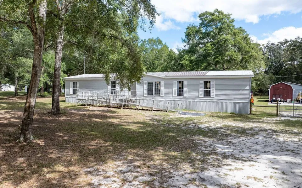 Welcome to this spacious 3/2 home with a bonus office space that could easily serve as a 4th bedroom, all nestled on over 5 beautiful acres. This property offers the perfect blend of comfort, functionality, and peaceful country living. Living Room boasts a cozy wood-burning fireplace—ideal for relaxing or entertaining family and friends. The kitchen shines with new appliances, a freshly tiled backsplash, and plenty of counter space for everyday use. Bedrooms are oversized, providing ample room for rest and storage. Home features new skirting and Starlink internet, and generator transfer switch. Step outside to enjoy your above-ground pool, and take advantage of multiple storage options: a 22x26 metal garage with a 10-ft door and 100-amp power, and a 12x20 wood shed. A cement parking pad with side extension adds convenience for guests or additional vehicles. Whether you’re looking for a quiet retreat or a property with space to grow, this home checks all the boxes—beautiful acreage, thoughtful upgrades, and modern comfort in one inviting package. roof 2015, A/C 2015. Handicap ramp does not convey with the sale, stairs will be added to the front entrance prior to closing.