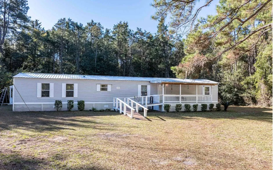 Welcome Home to this very nicely updated 16x80 3Br/2Ba home on a beautiful 4.32 acre lot. This home is tucked away for your privacy, located off of a paved road and nicely cleared with a tree buffer from the road. Home features a beautifully updated kitchen with new cabinets and butcher block countertops, spacious rooms, luxury vinyl plank flooring, spilt bedrooms, metal roof, upgraded FHA approved skirting, updated water heater, covered front and back porches, detached carport, and 3 storage sheds. One of which is insulated with power and a front porch, it could easily be converted to a home office/hobby room/or man cave! High & dry all of property is outside flood prone area, and no HOA! A wonderful place for your family to call HOME!