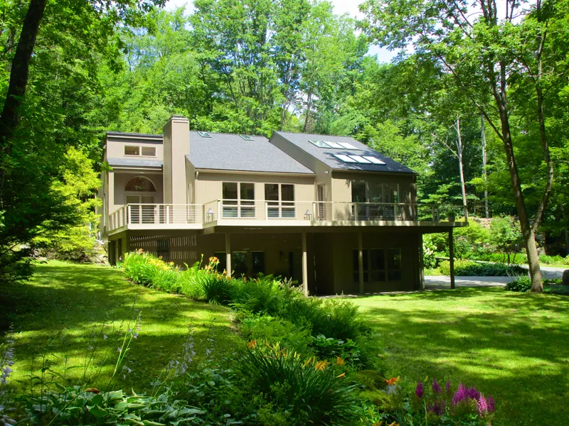 Sited in a woodland garden, this stylish contemporary has plenty of room for living and working. A total and meticulous renovation has this home move-in ready: the roof and siding have been replaced; a stunning new cook's kitchen has been installed and the bathrooms thoughtfully updated. Every wall, inside and out, has a fresh coat of paint and there is new hardware throughout. The main level has an open floorplan with living, dining and kitchen areas sharing a wall of windows with access to a large wrap around deck blending interior and exterior spaces. The living area has a bluestone fireplace and high ceilings clad in wood. An entry hall, two bedrooms, two baths and a laundry closet are also on the main level. An open staircase leads to the primary suite with its own bath, walk-in closet and a large bedroom with skylights and an arched window framing parklike views. The lower level has its own kitchen, living area, bedroom with fireplace and a bath. There is another room that could function as a bedroom, home gym or office. The lower level can function as a separate apartment: ideal for extended family or generating rental income. There is a new Viessman boiler/hot water tank and a backup generator. Ideally located between the Berkshires and the Hudson Valley and an easy commute to New York and Boston.