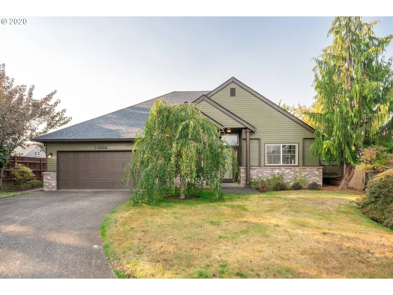 Stunning three-bedroom, two bathroom home with 1,402 square feet of living space in the heart of Scappoose. Open concept main living area with soaring vaulted ceilings. Light and bright kitchen with a large picture window and eating area. Sunken living room with cozy gas fireplace and French doors out to your fully fenced backyard. Primary bedroom suite has en-suite bath and dual vanity and access to private patio. Short drive to Scappoose Bay for kayaking and boating adventures!