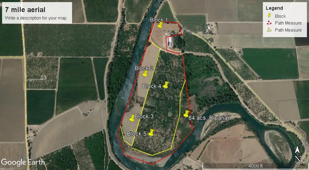 Property consists of 251 gross acres M/L. 165 acres M/L planted to walnuts with 50 acres M/L in chandlers planted 2020 & 2021 irrigated by micro sprinklers. 115 acres of Hartleys planted 1964 irrigated by hand move sprinklers. Sellers are currently pulling approx. 60 acres of the Hartleys to be replanted to Chandlers spring 2023. The remainder 84 acres is Riparian. Property is irrigated by 3 wells. There is a manufactured home and shop. Block 2 - 5 are subject to flooding from the Sacramento River.
