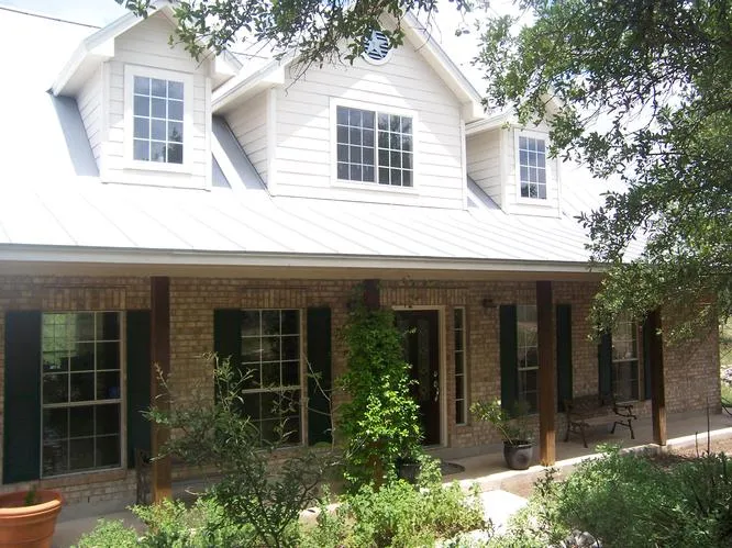 Fantastic environmentally maintained property! Owner focuses on water conservation with 3500 gal. concrete rain retrival tank, aerobic septic with gray water system piped to back of property, over 50 native plants, large raised bed garden, and fossils!Wet weather creek! Fenced and cross-fenced for horses or pets. The home has a large screened porch between the house and double garage. New life-time standing seam metal roof, Zoned AC, New Bosch Range. Charming hill country decor with wood burning fireplace, Satillo tile floors. Mother-in-law/guest suite downstairs as well as master down. 2nd living area splits upstairs bedrooms and bath. Decking up and down with VIEWS!
