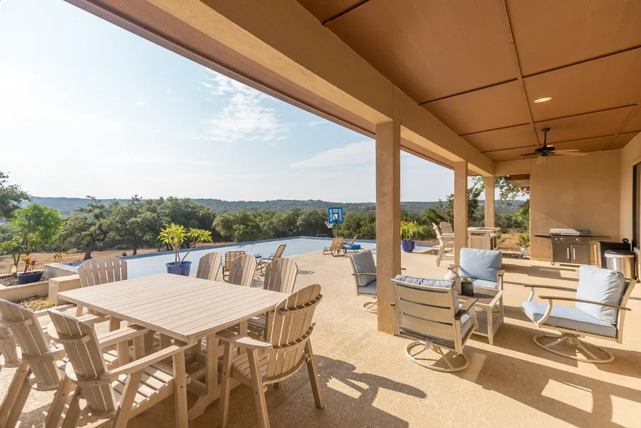 The estate unveils a lavish outdoor space, where refined interiors meet the enchanting Texas outdoors, showcasing a sparkling 20 x 40 Pool, a Sundek Patio, and intimate seating areas by the creek, perfect for relaxation and entertainment under the vast Texas sky.