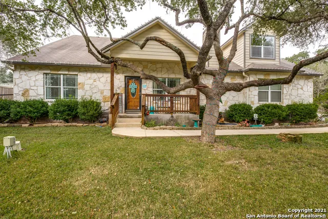 Step inside this beautiful two-story home nestled on approx. half-acre lot in the coveted Rivermont community. The traditional stone exterior is paired with a well-kept lawn, soaring ceilings, and an open floor plan. Cook up some fun in the eat-in kitchen with breakfast bar, ample counter space, and custom cabinetry. This space overlooks the spacious living area, showcasing a cozy stone fireplace, tile floors, and large windows that allow natural light to fill the room. Conveniently located on the main floor is the primary suite with a vaulted ceiling and a relaxing en suite with dual vanity, and a combo shower and soaking tub. Upstairs offers three nicely sized bedrooms and a bonus room that can function as a secondary living area or playroom. Enjoy hosting loved ones in the large back yard with a privacy eight-foot wood fence. The extensive back patio is equipped with a TV, and the covered above-ground pool will be refreshing during those hot summer months. The property is pipe fenced with an automatic front gate. Additional features include beautiful mature trees, a large 20x40 workshop, a new water well pump installed in November 2021, one AC unit was replaced in 2021, and the other AC unit and water heater in 2019, and side garage entry. Residents will enjoy the fabulous amenities of Rivermont, including three community parks, a pool, sports field, pavilion, and a river park with access to the Guadalupe River.