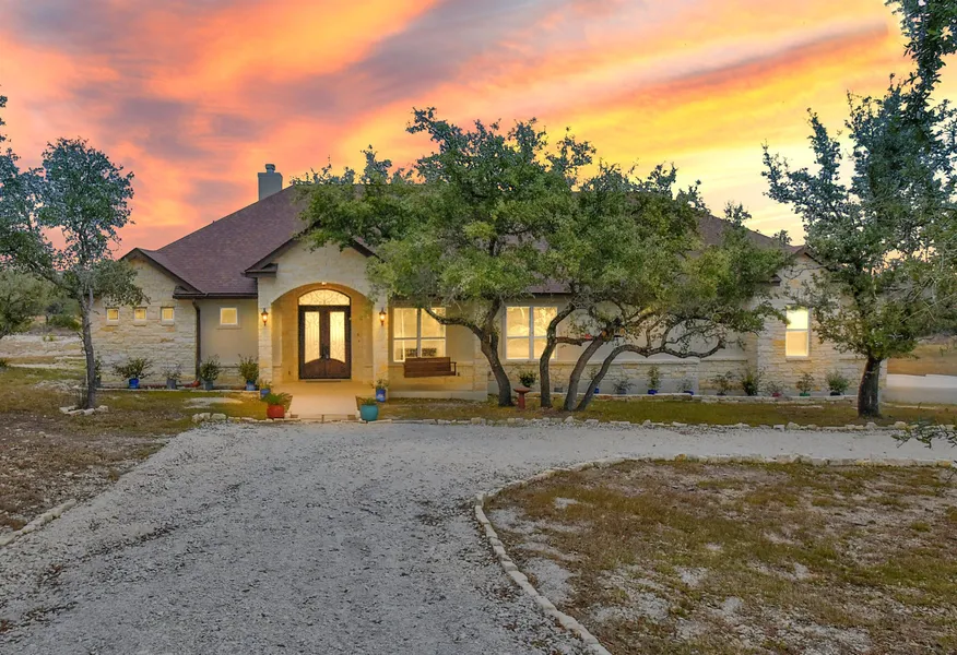 Luxurious Home surrounded by breathtaking Hill Country Views on 3.08 Acres, Built in 2020 and minutes away from beautiful Canyon Lake. This stunning home has 4 Bedrooms, 4.5 Baths, all bedrooms have their own private bathrooms, Chef's Gourmet Kitchen, Office/Study, Media Room, two fireplaces, Oversized 3 Car attached Garage, a large detached Workshop, and Basketball Court. Open Floor Plan with Family Room to include vaulted 15' ceiling with solid cedar beam and dual burning fireplace surrounded with marble tile. Chef's Gourmet Kitchen with appliance package: NXR Commercial Culinary 48" stainless steel 6LP w/ griddle and double ovens, with LED lights and Commercial Vent Hood w/ pot filler. Marble tile backsplash throughout kitchen with Italian Mosaic tile backsplash behind stove, large walk-in pantry. Under cabinet LED lightening, 38 bottle two-zone wine cooler with LED lights, Samsung upgraded Dishwasher. Huge Kitchen Quartz Island with porcelain farmers sink to include motion sensor faucet and push button garbage disposal. Custom cabinets throughout kitchen and bathrooms with soft close doors and drawers. Quartz countertops in kitchen, bathroom, laundry room, and detached shop. Recessed ceilings in Master Bedroom and Study. 10' ceilings throughout home and crown molding in master bedroom and kitchen. Master Bath oversized walk-in shower with 3 showerheads to include rain shower w/ two seats. 72" Cast Iron double slipper pedestal tub w/ classic chrome freestanding tub faucet, walls surrounded w/ marble. Covered back patio 20x10 w/ wood burning stone fireplace to include T&G ceilings, ceiling fan and TV hookup. Covered patio from Master Bedroom w/ built-in swing. Second Story solid wood balcony w/ metal railing overlooking ominous hill country views. Huge 25X25 workshop w/ single garage door and metal door entrance w/ remote and keypad to include large storage in attic. Lot has been cleared and prepped for future pool/spa to include 100 amp electric panel. Large cement slab 50X45 basketball court or can be converted to a future outdoor living space w/ running water and electrical outlet. Full sized volleyball area w/ poles and water. Massive backyard to include future barn with livestock (some restrictions may apply). Mystic Shores is a beautiful Hill Country Community with a Waterfront Owners Park on Canyon Lake to include Playground, pool, basketball, sand volleyball, tennis, pavilion, walking trails etc.