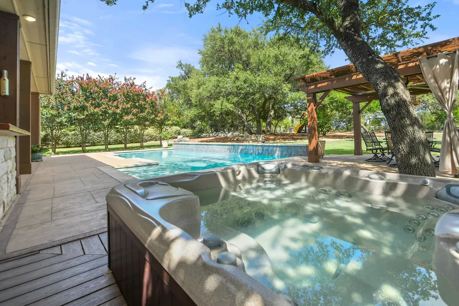 Enchanting backyard with outdoor living space and 38 foot pool, with 3 waterfalls w/lights, nestled among gorgeous oaks! Find your happy place in this fabulous outdoor retreat with sweeping covered patio, separate gazebo area with outdoor fireplace and pizza oven, and outdoor kitchen area with Twin Eagle Grill, sink and burner. Detached workshop/storage building with electricity. Did I mention the treehouse? Spacious Jimmy Jacobs custom home with huge bonus room upstairs and picturesque view of the backyard. Simply stunning!