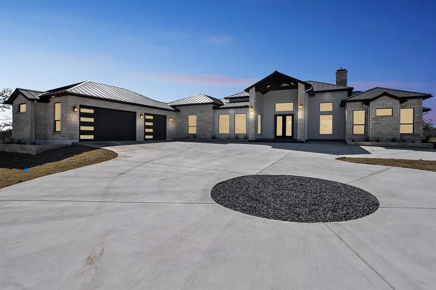 Stunning lake views from every front facing window, front porch, driveway, etc. Beautiful one-story home, construction began in 2022, finished in Feb 2023, never lived in. Located in a vibrant and active community on the shores of the Guadalupe River and close to Canyon Lake. Located so close to the river and lake, water sports and activities are abundant. A gated community, The Peninsula at Mystic Shores, with its own POA, and Mystic Shores, also with a POA, provide an amazing list of amenities. Residents of The Peninsula pay dues to both POAs. Exterior is stone and stucco with a metal roof. The lot is 1.47 acre, and sod has been placed around the home, while the rest of the lot has been left in its natural state. Interior is luxury wood-look tile throughout, recessed lighting throughout, quartz counters, high ceilings with stained wood beams in the living area, electric and propane sys...