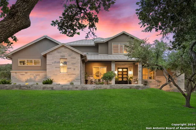 Immaculate hm located in the highly sought after golf course subdivision of River Crossing. Situated higher up w/beautiful views on a tree filled corner lot. This custom built, modern hill country home boast quality & exceptional taste. Upgrades galore! White quartz kitchen counters, custom cabs, stainless appl package, dbl ovens, gas cooktop & pull out drawers. HIGH efficiency home w/full foam insulation, insulated garage w/epoxy flrs & water softener. Plantation shutters thruout, upgraded lighting & fixtures, wide plank wood grain ceramic tile on entire 1st flr. Metal Roof, custom front & rear heavy metal doors. Covered back patio, outdoor kitchen w/Green Egg & gas grill, fire pit and more!!!