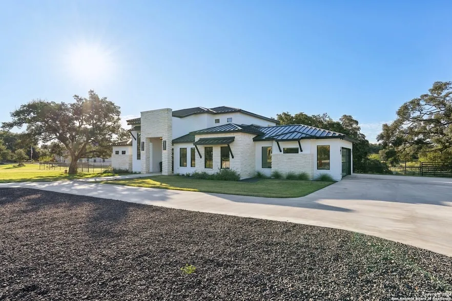 Welcome to 583 Curvatura. This newly constructed stunning retreat sits on over 2.5 acres of natural beauty in the heart of the sought-after community of Vintage Oaks. Surrounded by mature trees and next to walk paths, this property offers a peaceful escape with the perfect blend of modern luxury and Hill Country charm. This elegant home features 4 bedrooms,3 full baths, and 2 half bathrooms. Upon entering, you are greeted by a breathtaking floating staircase, an architectural masterpiece that sets the tone for the rest of the home. Throughout the property, custom ironwork adds a touch of artistry and sophistication, from the railings to the decorative accents. The oversized chandeliers accent the high ceilings, natural light, and upscale finishes. The gourmet kitchen, equipped with sleek countertops, stainless steel appliances, and an oversized walk-in pantry, is ideal for both everyday meals and entertaining. The primary suite serves as a serene escape, with a luxurious ensuite bathroom featuring dual walk-in closets, a soaking tub, and a separate walk-in shower. You'll find a second oversized bedroom with a spa-like ensuite bathroom on the first floor. Upstairs, you'll find two large, oversized bedrooms and a game room with a patio overlooking God's country and offering amazing views. Enjoy your private paradise with a sparkling pool, and outdoor kitchen surrounded by beautiful natural trees. The expansive yard provides endless possibilities for outdoor activities, gardening, or simply relaxing in your oasis. Vintage Oaks community amenities are equally impressive, including a resort-style pool, a lazy river, multiple sports courts, a state-of-the-art fitness center, and various community events that foster a vibrant and welcoming neighborhood atmosphere-located just minutes from local parks, top-rated schools, shopping, and the famous rivers of New Braunfels, as well as the historic Gruene District.