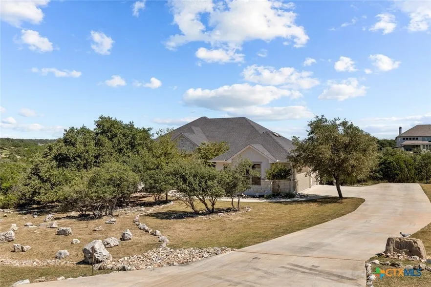 Welcome to this stunning 3-bedroom, 2.5-bathroom home nestled in northwest New Braunfels, just a short drive from the scenic Canyon Lake. The exterior boasts elegant craftsmanship and meticulously maintained landscaping that enhances the home's curb appeal. Upon entering, you'll find a private office space to the left, complete with a built-in desk-perfect for a home office or study, away from the bustle of the main living areas. Moving down the hallway, the home opens into a grand living area featuring soaring ceilings, large windows that flood the space with natural light, and a cozy fireplace framed by built-in shelving, creating a perfect focal point for the room. The kitchen, ideal for entertaining, is outfitted with sleek granite countertops, abundant cabinet and counter space, and built-in stainless steel appliances. Its spacious layout offers plenty of room for hosting and gathering. The master suite, a true retreat, boasts high ceilings and expansive windows that overlook the backyard and open to a covered patio. The ensuite bathroom features dual vanities positioned across from each other, a luxurious soaking tub as the centerpiece, and a walk-in shower with dual showerheads for added luxury. Step outside to the large backyard, where a covered patio-complete with two ceiling fans-invites relaxation or entertaining. A stone walkway leads to a charming outdoor fireplace area with seating, surrounded by natural stone accents, perfect for cozy evenings. This home's prime location near Canyon Lake offers easy access to outdoor activities and the natural beauty of the Texas Hill Country. Set in the serene countryside, this home offers a peaceful retreat with all the comforts of modern living, blending rustic charm with contemporary elegance. Spacious 3-car garage with an impressive 8-foot tall ceiling, offering ample storage and flexibility for larger vehicles or home projects.