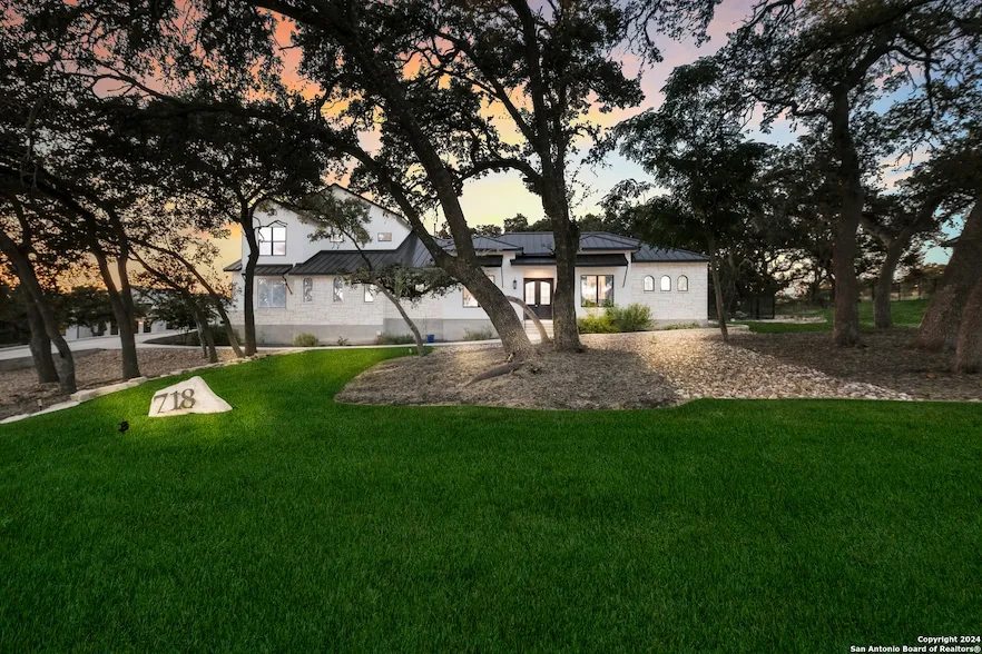 This custom 1.5-story home features a chef's kitchen with 6 burner La Cornue gas range, Sub-Zero, a spa-like primary suite, and a park-style backyard with room for a pool-designed for privacy, entertaining, and effortless living. Located in the highly sought-after Belle Oaks community in San Antonio, this custom luxury home offers an ideal blend of modern design, privacy, and functionality. Set on a large, wooded lot, the 1.5-story floor plan features 4 bedrooms, 3+ bathrooms, flex spaces, a home office, and a 3-car garage, making it ideal for families, remote work, and multi-generational living. The open-concept living area is anchored by a gourmet chef's kitchen with La Cornue 6-burner gas range, Sub-Zero refrigerator, quartz countertops, walk-in pantry, and oversized island with bar seating. Expansive windows flood the home with natural light and showcase peaceful backyard views, while a double-sided fireplace connects the kitchen and living room. The main-level primary suite offers a private retreat with a spa-inspired bathroom, featuring a walk-through shower, freestanding soaking tub, custom cabinetry, and premium finishes. A secondary bedroom and bath on the main floor provide flexibility for guests or in-laws. Upstairs, two additional bedrooms, a full bath, and a spacious game or media room create a quiet, private living area. The backyard oasis includes a covered patio, mature trees, irrigation system, gated access, and a fenced turf area for pets, with ample space to add a pool or outdoor kitchen. Enjoy peaceful Hill Country surroundings just minutes from Highway 46, shopping, dining, top-rated schools, and all that San Antonio has to offer. This Belle Oaks home delivers luxury living, privacy, and convenience in one of San Antonio's premier gated communities.