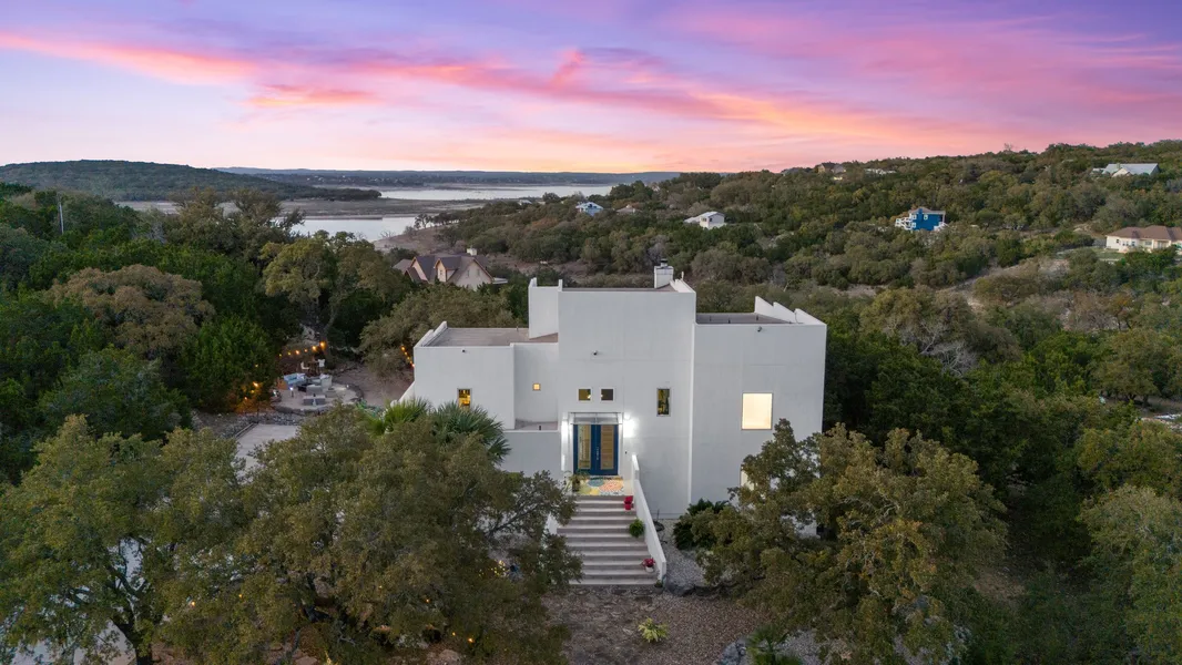 Nestled in complete seclusion, this stunning contemporary two-story home offers gorgeous lake views, unparalleled tranquility, and an abundance of natural light. Towering windows frame the picturesque surroundings, while an expansive patio and multiple outdoor sitting areas invite you to relax and soak in the beauty of nature. Designed to embrace its surrounding, the 14 ft ceilings and grand living room are centered around a striking stone fireplace. The open-concept design flows seamlessly into the dining area and a spacious gourmet kitchen. The countertops, uniquely sourced from the bottom of the waterfall, add a distinctive touch of nature's artistry. The primary bedroom is located upstairs on the main floor to maximize the lake views while all guest bedrooms and an additional living room are downstairs for privacy. Designed for both comfort and convenience, this home features a...
