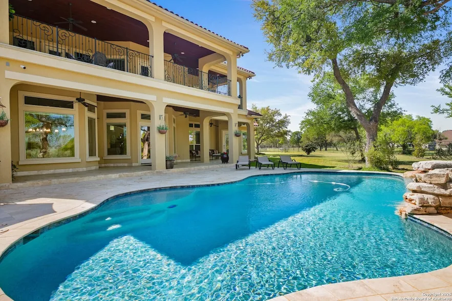 Listed Below Recent Appraised Value - Luxury Hill Country Estate on 7.25 Acres! Welcome to this one-of-a-kind, meticulously maintained custom home, offered at a rare value and priced below the current appraised value. Situated on 7.25 serene and beautifully landscaped acres, this one-owner estate offers luxury, privacy, and convenience with quick access to Hwy 46 and 281. This thoughtfully designed home features 5620 square feet, five spacious bedrooms, a private study, and five full bathrooms. You'll find elegant built-ins throughout, hand-scraped wood floors, and travertine tile that flows seamlessly from room to room. The gourmet kitchen is a true centerpiece, boasting an oversized island, rich custom cabinetry, a massive walk-in pantry, and high-end finishes perfect for entertaining or everyday living. A spacious utility room provides added storage and functionality. The primary suite is your personal retreat, featuring a spa-like en-suite bath, an expansive walk-in closet, and private access to the patio and resort-style pool. Outdoors, enjoy the best of Hill Country living, complete with a private well, storage tanks, and a full-house propane generator. Entertain on the oversized covered patio, lounge by the luxury pool with a waterfall feature, and take in the views from the extra-long upstairs balcony. Other exceptional features include: *8-foot fencing with gated entry *3-car garage with EV charging station *Mature oaks, blooming roses, and lush landscaping *Custom-built treehouse *Built-ins throughout for added charm and storage. This home has been lovingly cared for and is truly move-in ready. Detailed list of additional information available.