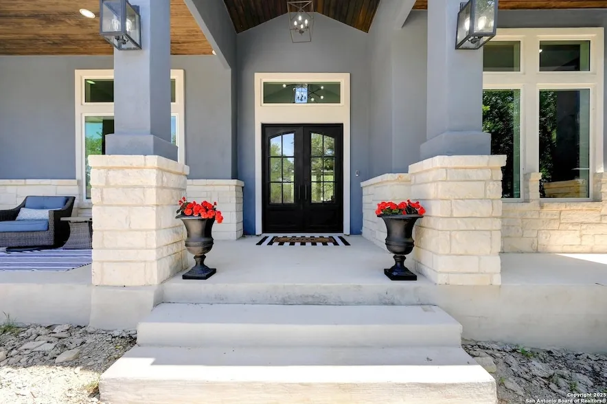 Looking to move to the TX Hill Country?! This gorgeous home sitting on a large 1.10 acre corner lot with mature trees and a circle drive in The Crossing of Spring Creek is a beautiful 4 bedroom, 3 bath, 2.5 car garage property offering the perfect blend of entertainment, comfort, and an open floor plan which includes a large flex space for your favorite hobbies, an office, and formal dining room for your guests! The kitchen is spacious with an extra large island, Zline 7 burner gas range, farmhouse sink, butler's pantry, with an ample amount of storage, walk in pantry and gorgeous herringbone backsplash! The heart of the home is warm and inviting, designed for both everyday living and entertaining with a beautiful mantle and cozy gas log fireplace to enjoy! Expansive windows throughout fill the home with an abundance of natural light! The oversized laundry room includes the perfect dog shower for every dog lover's delight! The flex space has beautiful floor to ceiling built in shelves for all of your hobby materials. The primary suite has a large retreat with a large bay window and an amazing wet room for your master bath/shower with an extra large freestanding tub and two large his/her closets. With two tankless water heaters and two A/C units, the home and garage is insulated with spray foam and radiant barrier keeping interior spaces warmer in the winter and cooler in the summer, buried 500 gallon propane tank, wired for ethernet in all rooms, indoor light switches to control exterior landscape lighting, full .5 acre rot iron fenced in yard with six stone columns, electrical in garage for workbench, the office and flex space are on a dedicated breaker, an extra bathroom off back porch to be used as a future pool bath has a handicap accessible shower, 4 wifi with 6 access points as part of a UniFi system managed by Dream Machine Pro, 18' vaulted ceiling in entry way, 16' ceilings in main house, and 12' ceilings in the bedrooms. The wonderful community park is just steps away with a pool, pavilion, sand volleyball court, soccer field, and walking trails along Spring Branch Creek! Welcome Home! OPEN HOUSE SUNDAY, MAY 4TH FROM 2-5!