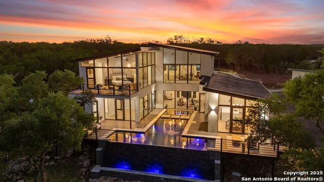 Unparalleled luxury and breathtaking 180-degree Hill Country views define this exceptional 1.22-acre estate in Spring Branch. The main house offers a stunning open layout with three bedrooms and three and a half bathrooms, all illuminated by grand windows that bathe the space in natural light. Built with steel and concrete, this Hill Country home offers unmatched strength, longevity, and energy efficiency-an exceptional foundation for your forever home. Inside a gourmet kitchen becomes the heart of the home, featuring a grand island with bar seating, top-of-the-line appliances, a 6-burner gas stove, dual ovens, wine fridge, and custom cabinetry with gold finishes. The primary suite is a true retreat, complete with a spa-like en suite bathroom boasting dual sinks and toilets, a standalone soaking tub, a shower with dual shower heads, a custom walk-in closet, a bar/ beverage area, and a pr...
