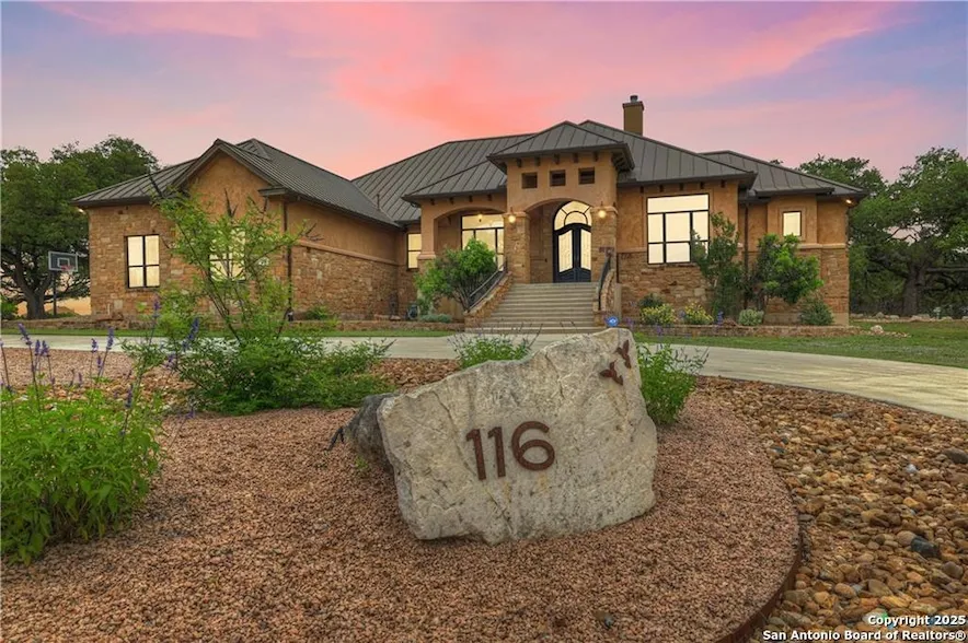 Step into luxury with this stunning Jimmy Jacobs custom-built home, perfectly positioned on a wide 1.12-acre lot in the prestigious gated community of Ensenada Shores on Canyon Lake. With over 200 feet of frontage, this property offers rare seclusion, surrounded by more than a dozen centuries-old live oak trees and enhanced by Texas Hill Country Views. Fully plumbed for propane. There is a beautiful Lakeview from back left of the lot. A sweeping circular driveway welcomes you with beautiful low-maintenance xeriscape landscaping in the front yard-designed for both curb appeal and water-wise sustainability. Step into this stylish 4-bed, 3-bath home with a dedicated office, media lounge, and game room-perfect for work or play! Craving extra space? Easily convert the media and game rooms into a 4th bedroom or luxe second suite with private patio access-great for morning coffee or effortless indoor-outdoor living. The open-concept floor plan showcases hand-scraped Alder wood floors and rich custom Alder cabinetry throughout. The chef's kitchen is an entertainer's dream, offering a massive island, stainless steel appliances, electric cooktop, and custom wood shutters-all combining functionality with timeless style. The oversized, climate-controlled (mini split) 3-car garage is a standout feature, equipped with built-in wood shelving, a workbench, and a mechanical lift that allows for effortless storage of tools and supplies directly from your truck bed into the expansive upper attic storage, keeping everything clean and out of sight. Enjoy the outdoors year-round on 850 sqft of patio space-ideal for dining al fresco, entertaining guests, or simply taking in the serene Texas Hill Country landscape. The home's 100% masonry sandstone exterior and standing seam metal roof ensure long-lasting beauty and structural integrity. Located in the sought-after South Lake area, with a private exit gate to Oblate Dr, this home offers both exclusivity and convenience-close to shopping, dining, and all that Canyon Lake has to offer. Some pictures have been virtually staged. There is no pool or furniture.