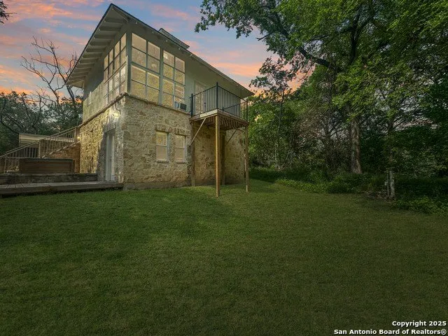 Rare Find! 100 feet Guadalupe River frontage in-town on almost 2 acres heavily wooded forest of towering oaks & elms. Very cool 2 story Alamo Stone cottage/weekend home. Lots of windows & views up and down the river. Spacious rock patio with hot tub & fire pit. This is a great place to relax & BBQ while watching the river activities. Wood deck on river's edge. Spiral stairs to loft/home office. Whether you're looking for a weekend getaway or your own everyday private oasis this is it.