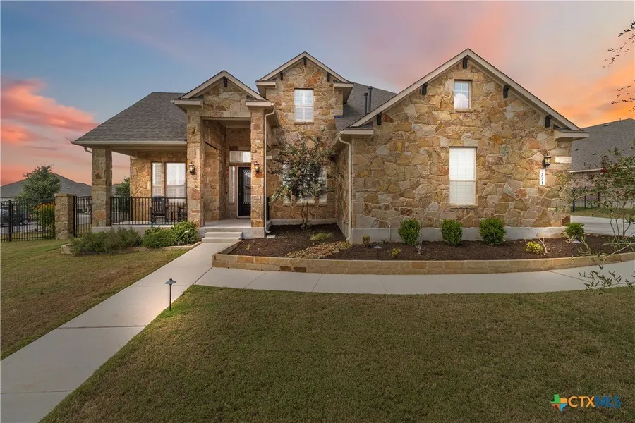 Discover the perfect blend of comfort and Hill Country living in this gently lived in 5-bedroom, 4-bathroom home with 3,542 sq. ft., built in 2021 and set on a 0.42-acre corner lot in the sought-after Manor Creek community. Designed for both everyday living and entertaining, the home features engineered hardwood floors throughout, plantation shutters, and art niches that add style and character. Downstairs master bedroom offers a huge space with a spa like bathroom with split vanities, walk-in shower, deep walk-in closet with custom cabinets. The chef's kitchen is a highlight, offering gas cooking, pot filler, granite countertops, a rough cut granite island, and stainless steel appliances, all complemented by a reverse osmosis water system. Flexible spaces include a downstairs mother-in-law suite w/ walk-in shower, private office and a media room, while the 3-car side entry garage with e...