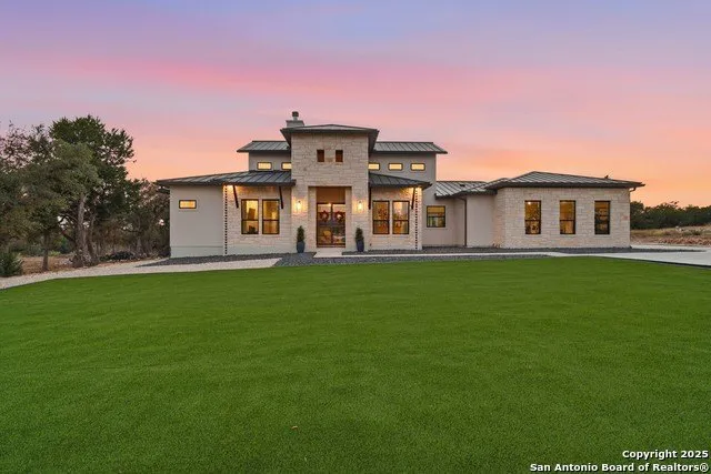 Welcome to this stunning Weston Dean custom home nestled within the guarded gates of the prestigious Copper Ridge community. This single-story masterpiece blends luxury, comfort, and impeccable design at every turn. Step through the grand oversized metal door and into an inviting living space filled with natural light from a striking wall of windows. The open-concept layout showcases soaring ceilings, a gas fireplace, and effortless transitions to the expansive covered patio-perfect for seamless indoor-outdoor living. The gourmet kitchen is a showstopper, featuring sleek quartz countertops, timeless designer backsplash, upgraded custom cabinetry, generous island, stainless steel appliances, and a hidden walk-in pantry. A dedicated office, game room, and attached media room-pre-wired for surround sound-offer exceptional flexibility for work, play, and entertainment. The split floor plan provides added comfort and privacy for guests. Throughout the home, oversized windows, elegant tray ceilings, & custom trim work elevate the architectural sophistication. The primary suite serves as a serene retreat with peaceful views of the beautifully xeriscaped backyard. The spa-inspired en-suite bath boasts a luxurious walk-in shower, impressive double vanity, modern finishes, and separate walk-in closets. Outdoor living is equally impressive. The covered patio is pre-plumbed for a future outdoor kitchen with gas, water, and electrical already in place. A pre-wired sound system extends to both the patio and the primary suite, while Cat5 wiring throughout supports a connected lifestyle. Low-maintenance artificial turf-totaling 4,500 sq. ft. across the front and back yards-ensures beauty and ease year-round. The 2.5-car garage includes a 50AMP plug for EV or RV charging, and the property features a 500-gallon propane tank, offering flexibility for a future pool. With its resort-style amenities and upscale Hill Country setting, Copper Ridge continues to be one of New Braunfels' most desirable neighborhoods-making this home a standout opportunity.