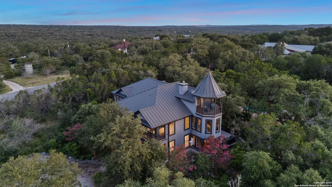 Rare opportunity in River Chase! Ideally situated on a corner lot with two convenient driveways, this exceptional property features a newly built 570 sq ft detached guesthouse, a sparkling pool, and an oversized 2-car garage-all framed by sweeping long-range Hill Country views. Inside, over 3,000 sq ft of remodeled living space showcases soaring ceilings, a double-sided gas fireplace, and abundant natural light. The gourmet kitchen is a true showpiece, with an induction cooktop, built-in refrigerator, custom cabinetry, and generous prep space-perfect for entertaining or culinary excellence. The main-floor primary suite offers a serene retreat, while the second-floor game room with wet bar provides stylish space for leisure and gatherings. Outdoor living is equally impressive, including a private 7'x33' deck off the second bedroom, a third-floor observation deck with panoramic vistas, and inviting poolside spaces. Additional features include a 30-amp RV hookup, EV charger, partial fencing, and a new standing-seam metal roof. Homes with this combination of privacy, acreage, modern updates, and a fully independent guesthouse are highly sought after in River Chase.
