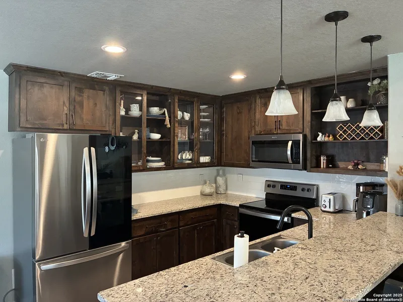 Modern Hill Country Home in Cypress Cove Built in 2022, this beautifully maintained 3-bedroom, 2-bath home offers 1,294 sq. ft. of stylish living in the sought-after Cypress Cove community. Set on an extra-large lot, the property combines modern finishes with Hill Country charm. Inside, you'll find an open-concept layout with ceramic wood-look tile flooring throughout-no carpet in sight. The kitchen features granite countertops, stainless steel appliances, and a functional design that flows seamlessly into the dining and living spaces, perfect for entertaining or everyday living. (Refrigerator does not convey.) The spacious primary suite provides a private retreat with its own full bath, while two secondary bedrooms offer flexibility for guests, family, or a home office. A dedicated laundry room adds convenience. Step outside to enjoy a fenced-in deck-ideal for relaxing or hosting weekend gatherings. The oversized lot offers plenty of potential to customize with additional landscaping, garden space, or outdoor features. As a Cypress Cove resident, you'll have access to community amenities including a swimming pool, fishing pond, playground, and sport courts. Plus, you're just minutes from Canyon Lake's Boat Ramp 11, as well as local dining and shopping. This move-in ready home delivers comfort, convenience, and the best of Hill Country living.