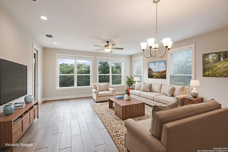 Wake up each day to breathtaking Hill Country views from your own backyard. This 5-year-old single-story home in Scenic Terrace sits along Canyon Lake with frontage on Sorrel Creek and a spacious, tree-filled lot perfect for outdoor living. Inside, an open floor plan features wood-look ceramic tile, a large kitchen island ideal for entertaining, and expansive windows that fill the home with natural light. Enjoy a covered one-car garage with storage space and a cozy back patio for relaxing in the peaceful surroundings. Just minutes from local amenities, this home offers the perfect blend of comfort, convenience, and Hill Country charm.