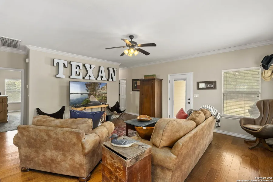 Spacious single-story home on half-acre lot in the Hill Country community of Canyon Lake, Texas. Built in 2012, this well-maintained 3-bedroom, 2-bathroom home offers 1,566 square feet of comfortable living space in the established Rocky Creek subdivision-where larger lots and natural privacy are the standard, not the exception. This home sits on a generous half-acre with mature trees providing natural shade and privacy. The flat, usable land offers endless possibilities-add a pool, create custom landscaping, build a shop or outdoor entertaining space. Unlike typical suburban lots, you have actual room to expand and personalize your property. The open-concept floor plan connects the kitchen, dining, and living areas with a convenient bar area-ideal for entertaining or everyday family life. Original wood floors add warmth throughout the main living spaces. The split bedroom layout places ...