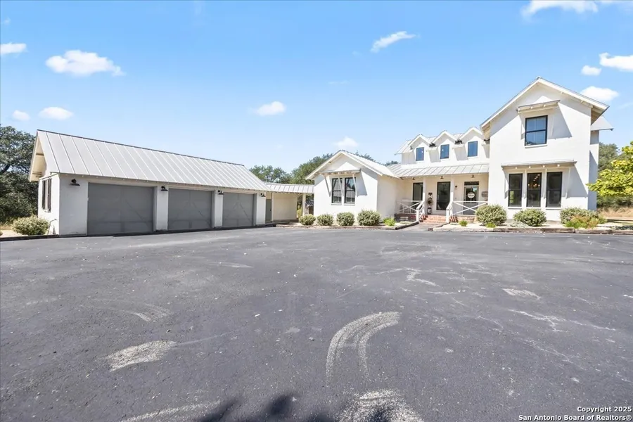 Where Hill Country elegance meets modern farmhouse living. Experience Hill Country elegance with modern farmhouse charm in this thoughtfully crafted custom residence, ideally situated on 2.95 peaceful acres in the desirable River Chase community between New Braunfels and Canyon Lake. From the welcoming front porch to the light-filled interiors, this home radiates warmth, comfort, and refined craftsmanship. Inside, vaulted ceilings, shiplap walls, and rustic hardwood floors create an inviting atmosphere that feels both fresh and timeless. The open living and dining areas flow effortlessly into a designer kitchen featuring custom cabinetry, butcher-block countertops, classic hardware, a striking backsplash, and a generous island with seating. A walk-in pantry and GE Cafe appliances complete this stylish and functional space. The private primary suite offers a serene escape with a freestanding clawfoot tub, spacious walk-in shower, and custom closet. Additional highlights include custom barn doors, a dedicated laundry room, and thoughtful details throughout. Step outside to your private Hill Country haven, where every feature is designed for relaxation and entertaining. The covered outdoor kitchen pavilion-complete with a wood-burning fireplace, built-in grill, and charming brick accents-sets the stage for unforgettable gatherings. The sparkling pool, framed by mature oak trees and twinkling string lights, adds a resort-inspired touch, while the rustic "outhouse" pool restroom delivers a playful nod to classic country living. Pet lovers will appreciate the home's unique Puppy Playroom, complete with its own AC unit, TV, and tiled dog bath, a true luxury for your four-legged family members. A three-car detached garage and paved circular driveway add convenience and functionality. Perfectly located just minutes from Gruene, Canyon Lake, and downtown New Braunfels, this home embodies the very best of Hill Country living, where modern design, everyday comfort, and timeless charm come together in one unforgettable property.