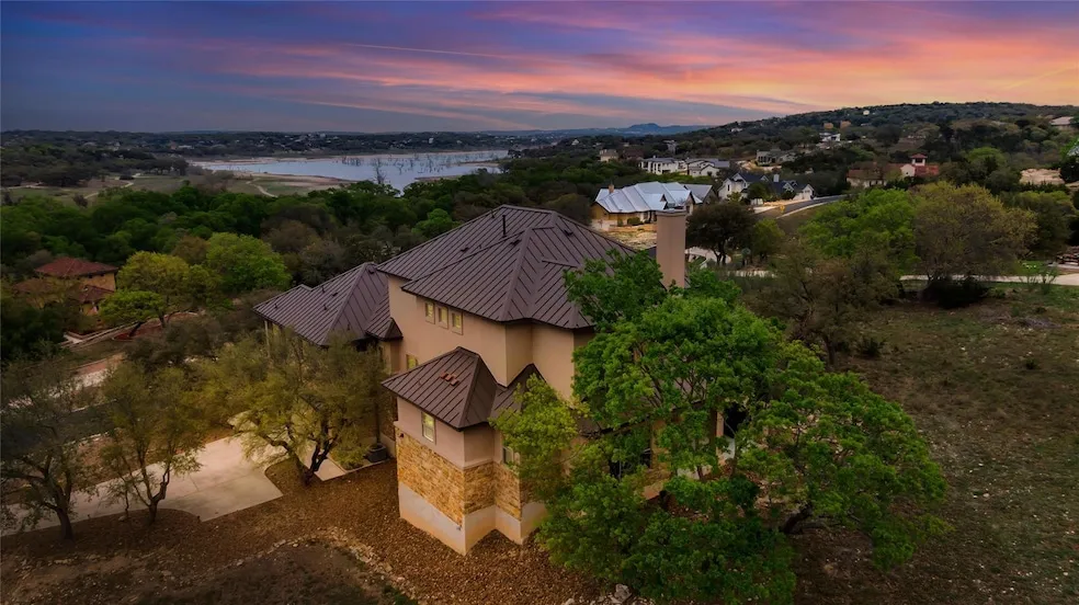 This immaculate luxury home offers a rare opportunity to own a residence that has never been fully lived in and has never been rented, presenting in pristine, like-new condition. Designed for both comfort and accessibility, the home features an elevator to the main level and full ADA-friendly living. Enjoy beautiful lake views with access to Tom Creek and Canyon Lake, all set on a spacious one-acre homesite. The main floor features an open, light-filled layout with a primary suite that includes a private balcony, plus a dedicated office that can easily serve as a fifth bedroom. The chef-friendly kitchen is equipped with a commercial-grade cooktop, convection oven, stainless steel appliances, built-in microwave, large stone and granite island, and custom cabinetry. The living room centers around a striking stone fireplace and picture windows that frame the lake and surrounding wildlife. Upstairs, three additional bedrooms offer a private balcony with scenic lake views. The upper balcony and back patio are wired for outdoor television, perfect for watching the game while cooking on the combination charcoal and gas grill conveniently plumbed to the home. A natural spring sits toward the back of the property, adding to the tranquil setting. The Texas Hill Country stone-and-stucco exterior is complemented by low-maintenance xeriscape landscaping with natural rock, mulch, and mature oak trees. Interior features include hardwood floors, electric shades, custom blinds, pre-wired surround sound, fiber-optic service, double-pane low-E windows, two tankless water heaters, whole-home water softener, water filter, and two zoned HVAC systems. Storage is abundant with large closets and custom cabinetry throughout. Even the finished garage features two large closets, a shop sink, and an electric door opener. Located in Las Brisas on the south shore of Canyon Lake, the community offers underground utilities and convenient access to hospitals, shopping, and everyday amenities.