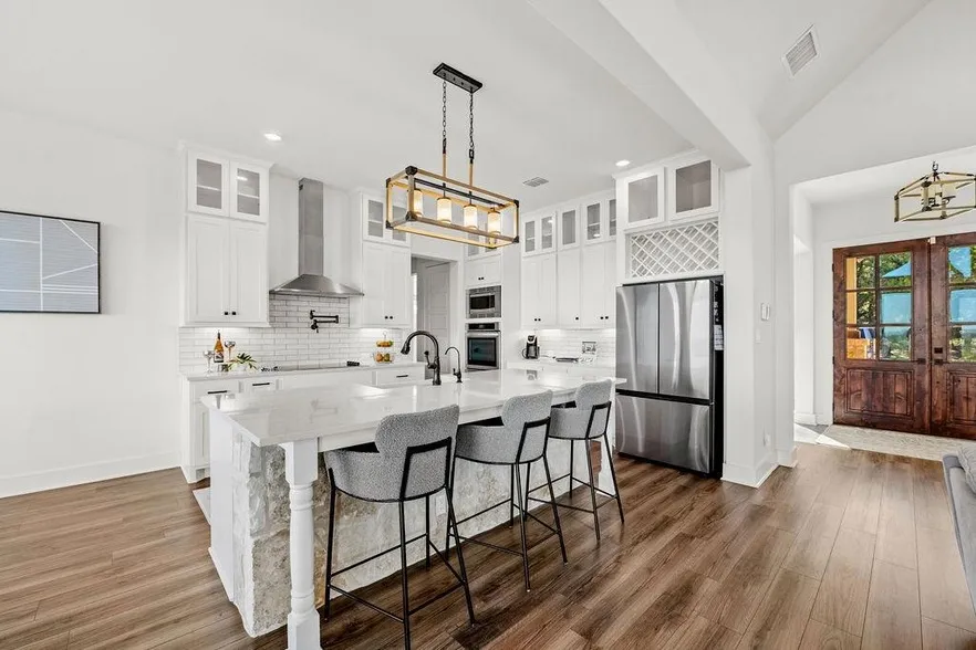Hill Top Views! Tucked privately on the pinnacle of a gently curving landscape in the heart of the Texas Hill Country, this sprawling property features a 2,974 sqft home nestled on a 2.99-acre lot with the best views in all of Fischer, Texas. Your living room has views that span miles, from the soaring ceilings to the wall of windows. You have a floor-to-ceiling fireplace with a raised hearth. Your kitchen features an island with a limestone base, subway tile backsplash, built-in ovens + microwave, built-in wine rack, farmhouse basin sink, smooth cooktop, and walk-in pantry. Located at the front of the home is a powder room perfect for guests and a dedicated office or mixed-use space. The large primary suite will not disappoint, with its sprawling views through extra-large windows and ample storage spread across two closets, including a huge walk-in closet with custom built-ins. The ensu...