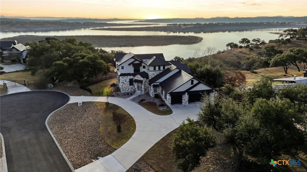 Experience true lakefront living in this stunning custom home located in the gated Peninsula at Mystic Shores on Canyon Lake. Set on 1.71 acres of prime waterfront with shoreline access, this 3,987 sq ft residence offers breathtaking, unobstructed lake views through expansive floor-to-ceiling windows that flood the home with natural light. This thoughtfully designed home features 4 bedrooms, each with its own private en suite bathroom, 4.5 baths. The open-concept living area showcases beautiful wood-paneled ceilings in both the main living room and primary suite, creating a warm yet refined atmosphere while framing panoramic water views. The large kitchen offers plenty of storage and workspace, ideal for entertaining and everyday living. A second-floor mini kitchen adjacent to the media room provides added convenience for guests or extended gatherings. Enjoy outdoor living with two spacious patios overlooking the lake, perfect for relaxing, dining, and taking in the scenery. The primary suite includes a custom walk-in closet with built-in storage for exceptional organization. Additional highlights include propane utilities and a three-car garage with ample space for vehicles and lake gear. With rare lakefront access, generous acreage, and luxury finishes throughout, this home delivers the ultimate Canyon Lake lifestyle in one of Mystic Shores' most desirable gated sections.