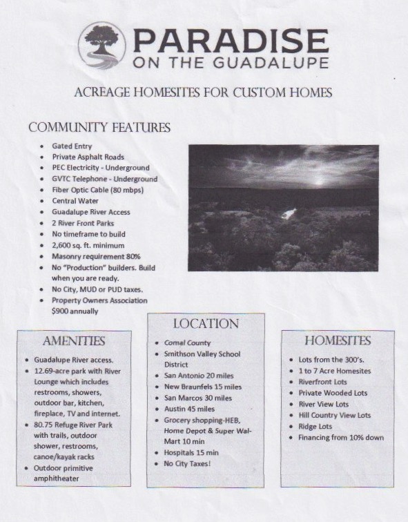 Paradise on the Guadalupe is one of the newest exclusive gated communities located on the Guadalupe River. Within the community you have biking & nature trails, kayaking, fishing, tubing, and a wildlife preserve that encompass more than 93 Acres! A secluded haven located conveniently between Austin and San Antonio, Paradise on the Guadalupe is located north of San Antonio in Comal County and features elevated, oversized homesites with stunning Hill Country views including Canyon Lake. This community of custom-built homes has the perfect balance of outdoor activities and onsite amenities, such as two waterfront parks and the River Lounge, an upscale pavilion. Paradise on the Guadalupe is just minutes away from local attractions such as golf courses, restaurants, boating, swimming, live music, wineries, entertainment, food and culture. For sale are two adjoining lots (66 & 63) in the pi...
