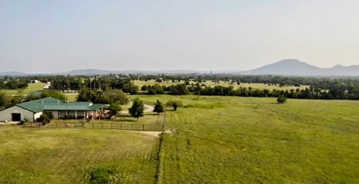 DREAM VIEW PROPERTY LOCATED NEAR THE SOUGHT AFTER WICHITA MOUNTAINS, LAKE LAWTONKA AND IN ELGIN SCHOOL DISTRICT ON 40 ACRES WITH A POND!!! This breathtaking panoramic view is located just a few miles from the Mount Scott area. Have a seat on the large Santa Fe outdoor wraparound patio and just take it all in. This property not only offers gorgeous views, but tons of opportunity. On this land sits a secluded beautiful hilltop metal home that offers approx. 2310 sq ft of living. Open floor plan with ceramic tile, granite countertops, a guest bedroom and bath along with a primary suite. The primary suite has a very nice sized walk in closet, large walk in shower and a large utility room straight off the bathroom. The home includes a 98% high efficiency heating and air unit that is only 9 months old, a Hepa air cleaning filter system, 3 year old roof and Low E windows. Within this 2310 sq ft...