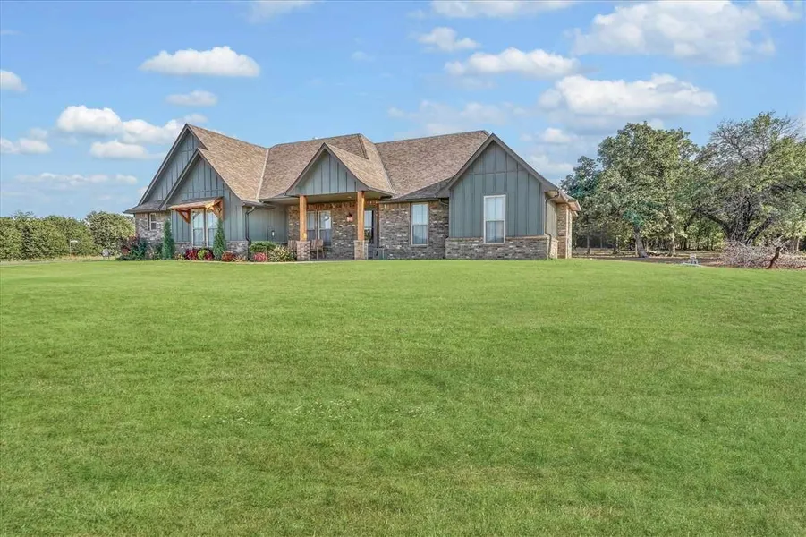 This is a one-of-a-kind property in a one-of-a-kind setting. Nestled among the oak trees of the Cache Woodlands, this four-bedroom, less-than-two-year-old home features a wonderful view of the Wichita Mountains and stunning sunsets from the front yard. But don’t let the setting and views distract from the beauty of this custom home. Designed as a “forever home” by the owners, it features top-of-the-line finishes throughout. It is a wonderful open-concept with a kitchen that is the focal point of the home. Cook to your heart’s delight with a gas cooktop and oven, an under-cabinet microwave, and dishwasher—all stainless steel. The oversized granite island is both elegant and functional. Beautiful maple woodwork—found throughout the house—provides abundant storage, a double trash-bin slide-out, and a full pantry. Off the kitchen is a large dining area with sweeping pasture views. The kitchen/dining also overlooks the great room, which features a beamed cathedral ceiling that accentuates a striking stone fireplace that runs from floor to ceiling, complete with a recessed space for a large-screen television. To the left of the fireplace is a game nook with built-in shelving and cabinets. The primary bedroom is spacious enough for a seating area and leads to an ensuite bath with double granite vanities, a whirlpool soaker tub, a large separate shower with a pebble-tiled floor, and a walk-in closet. Every aspect of this home was carefully planned, from arched passageways to custom lighting elements. On the west side of the home are three generously sized bedrooms with a full bath and double vanities. Flooring includes wood-look plank tile throughout the main living, dining, kitchen, and bath areas, with carpet in the bedrooms. The laundry room offers “loads” of storage and a mud bench sits conveniently across the hall. The garage is oversized, as the owners added four feet to the standard two-car plan for extra space. There’s no need to worry about hot water with the gas tankless water heater, which is supplied by a Halo2 water-purification system. Out back, a covered patio spans nearly the length of the house and ends in an outdoor kitchen area. The backyard is like a park on nearly 1.8 acres, and a 10’ x 12’ concrete slab has been poured for easy installation of a future shed. All of this comes with Cache Schools and is only five minutes west of the town of Cache. This could be the home of a lifetime—why not make it yours? Call Barry Ezerski at RE/MAX at 580-704-7355 to see the home of your dreams today.”