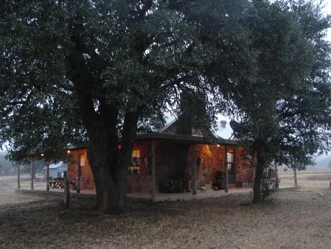 The country home is rocked and surrounded by covered porches with cedar post columns. It has 3 bedrooms and 1 bath, living area and kitchen with sit down bar between them allowing for family interaction, and a beautiful rock fireplace. The country charm and character of the house will make you feel relaxed and right at home from the moment you enter. From the kitchen you can gaze over the field in the back and enjoy watching the deer come in. Other amenities include an old time wood barn with horse stalls, roping arena with lights, storage shed, and shop with game room. The game room gives you the perfect place for entertaining large groups and just relaxing with family and friends. Water for the house and barn is supplied by a well with water that is the best tasting you will ever find. Around the barn, home, and arena there are numerous large live oaks creating a park like setting.
