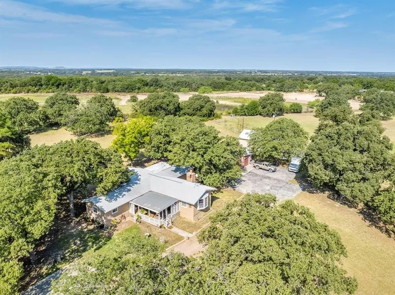 Welcome to this charming 3 bedroom, 2 bath home nestled on 4 acres of quiet, park-like landscape in Comanche County. This home offers plenty of room to grow and enjoy country living. Step inside to an open floor plan with an oversized living room with a wood-burning fireplace, bay window, and built-ins - perfect for cozy evenings or entertaining guests. The kitchen features a gas cooktop, dishwasher, and refrigerator. The kitchen has two adjoining rooms that can serve as a dining room, hobby room, and or serving area. The outdoor living is exceptional: large covered porches front and back invite you to relax, and mature oak & pecan trees offer shade and charm. Adding to its appeal are several outbuildings: a 40×30 insulated metal 3-bay garage, and a 25×12 storage building with electrical and plumbing. The lot is level with some trees for privacy, yet open enough for flexibility with outdoor uses and landscaping.