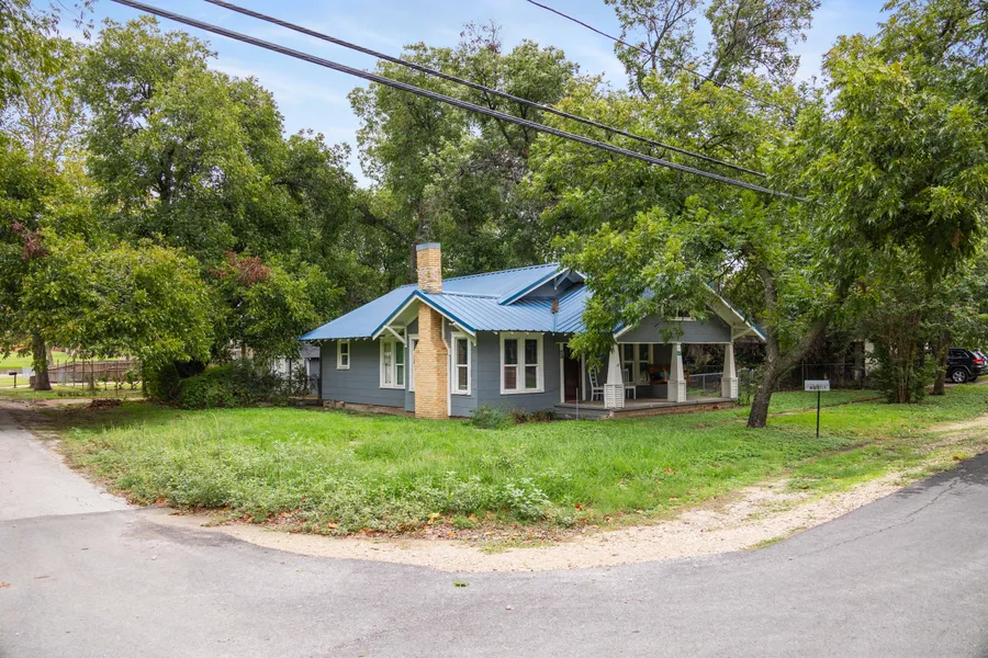 Outside the home has a metal roof, a chain-link fenced yard, a front porch with a swing, a 2 car detached garage with storage area and a nice corner lot with large Pecan trees.