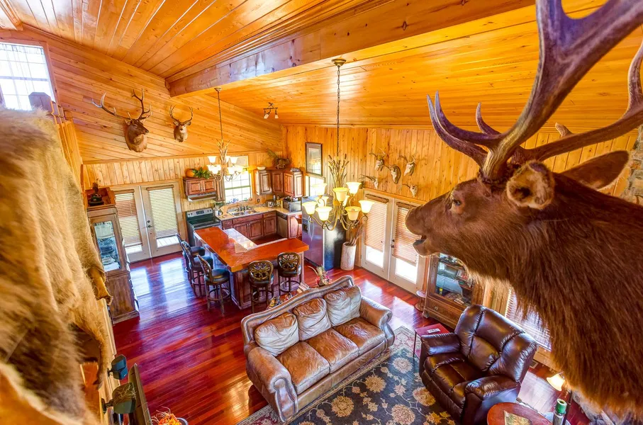 The lodge was constructed in 2007 and has beautiful Brazilian Cherry wood floors, Cypress and Juniper ceilings, Walnut walls, and pine and oak throughout the rooms. An upstairs loft is currently used as an office and sitting area. A wraparound porch paired with a Bose entertainment system make it a fun place to host friends and family. There is also a gas log fireplace in the living room to enjoy on cold winter days.
