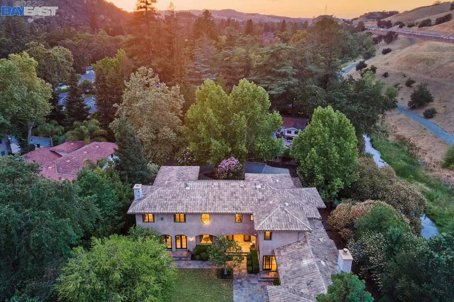 Custom Alamo estate architected by Joseph Gorny sets on a gated private lane comprised of 5 Bdrms+Executive Office in a very private setting. The grand foyer, w/ its marble floors, 4 FP's, powder room lined in Venetian plaster walls, soaring ceilings outline in coffered, arched & beamed details, & gorgeous distressed Walnut hardwood floors, sets the tone for this sumptuous custom home. The quality & craftsmanship of this modern Mediterranean enthrall in the details from wall+ceiling elevated texturing, wine cellar, brass finishes, elegant chandeliers & custom built ins. Formal LR lined in French Doors leads to the bkyd perfect for entertaining. An expansive bkyd+Side yard+Courtyard embellishes expensive slate stone, w/ attached logia comprised of shiplapped ceiling w/ fan, built in speakers & gas FP. Au-Pair setup on lower level w/ sep. entry. Chefs kitchen w/ butlers pantry/wet bar, 3 ovens, dual dishwashers, & vast center island has every imaginable convenience to handle gatherings.